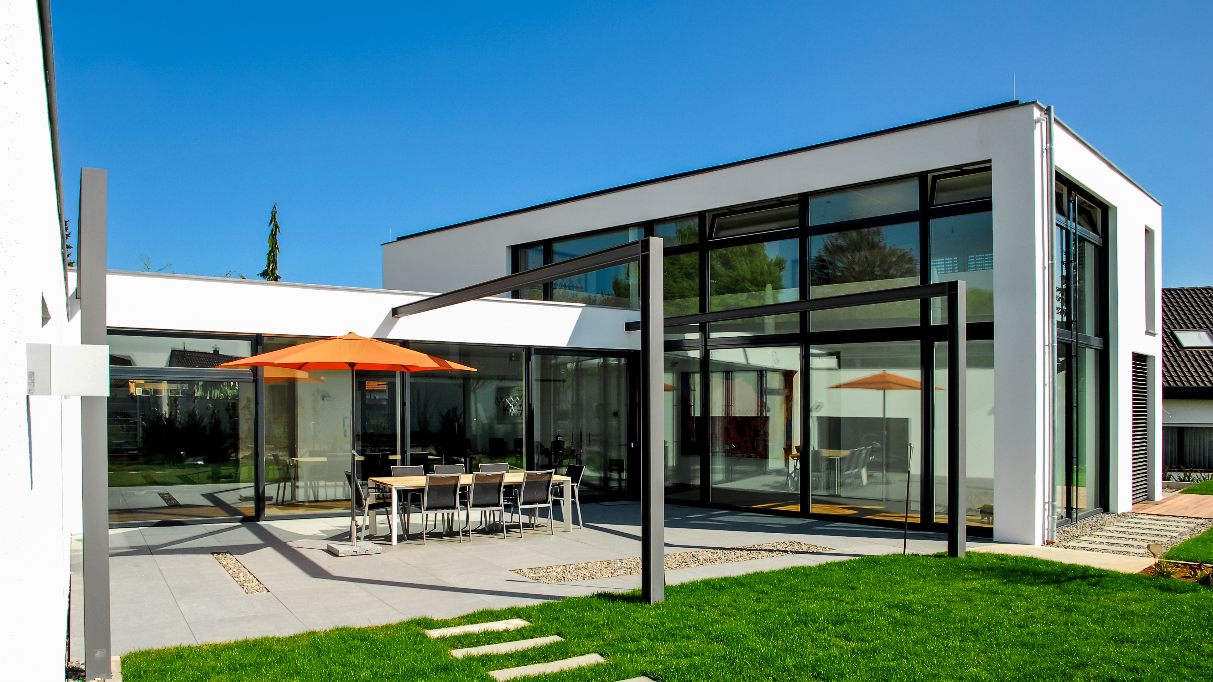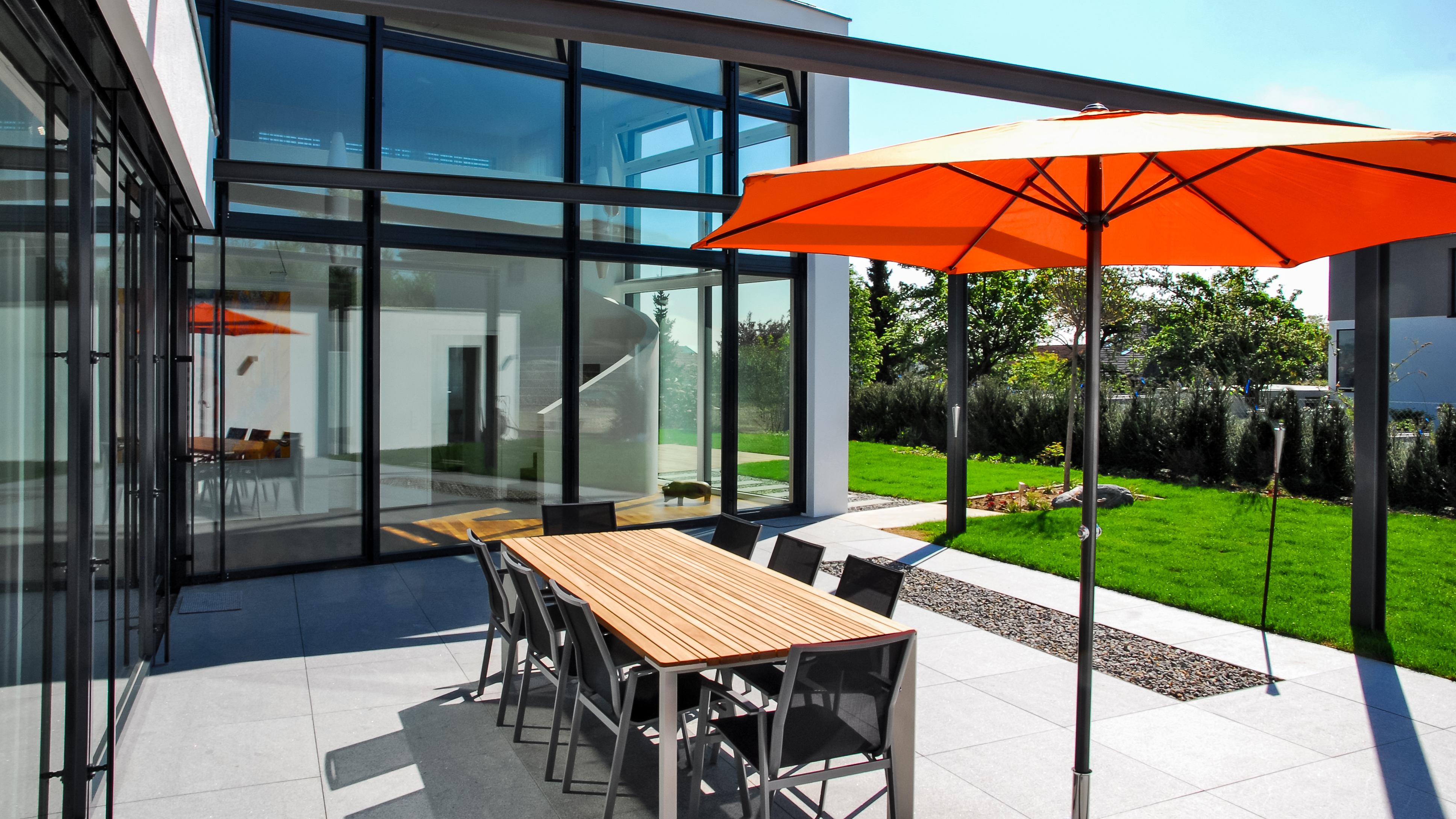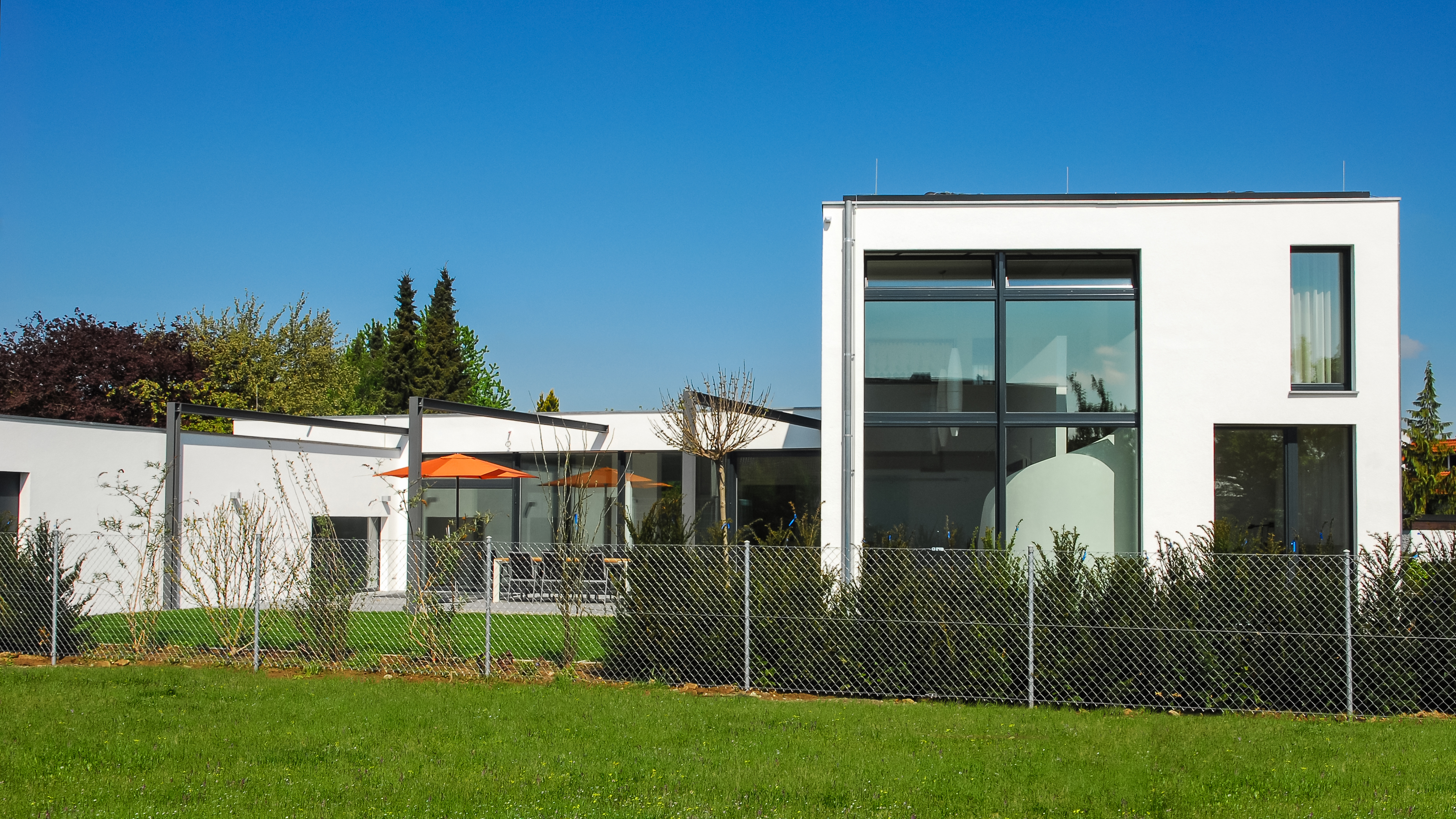 Passive Solarenergienutzung durch großzügige, hochwertige (3-fach) Verglasungen, die nach Süden und Westen ausgerichtet sind.