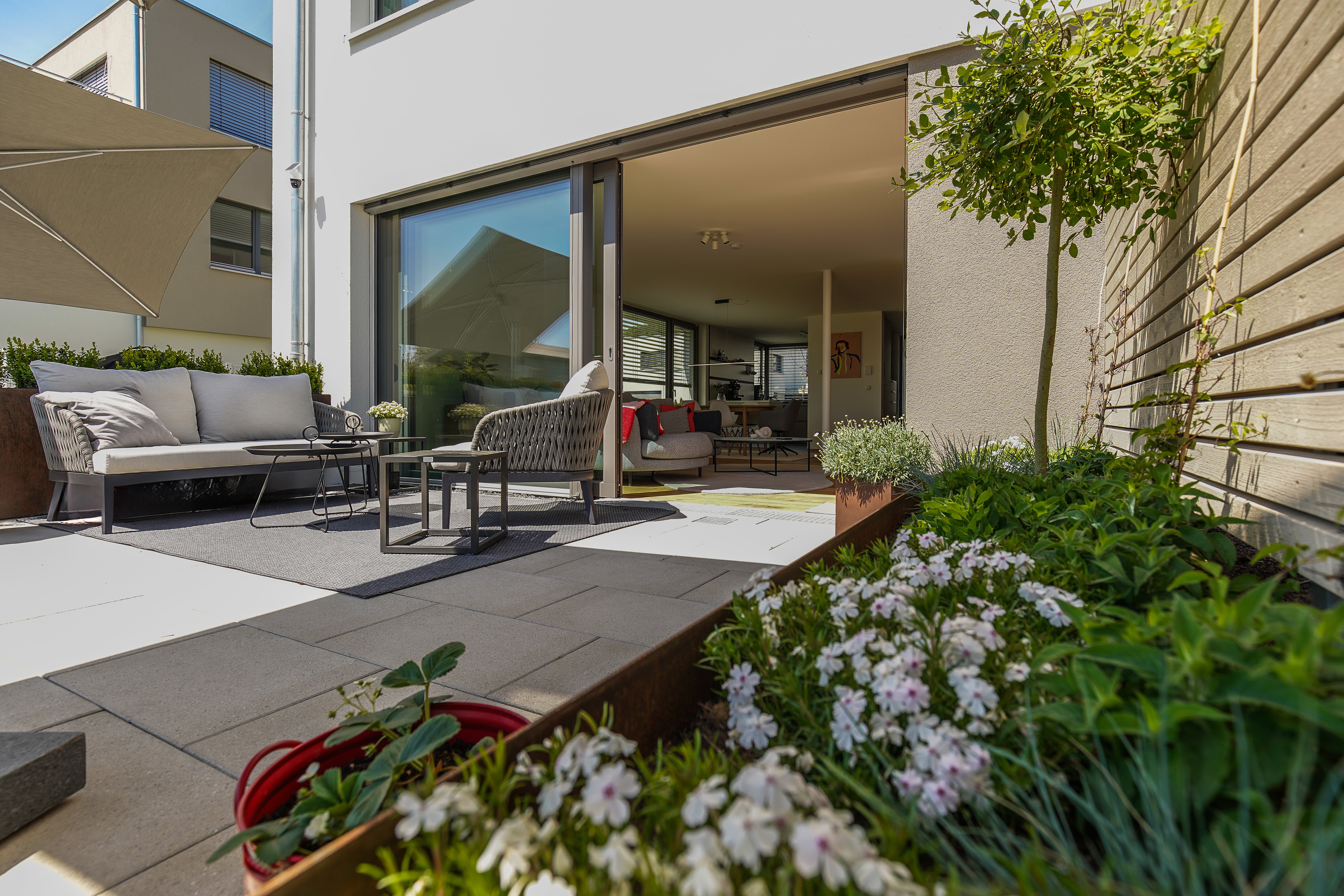 Außerdem verfügt jedes der Reihenhäuser über einen eigenen Garten sowie bei drei Geschossen zusätzlich über eine Dachterrasse.
