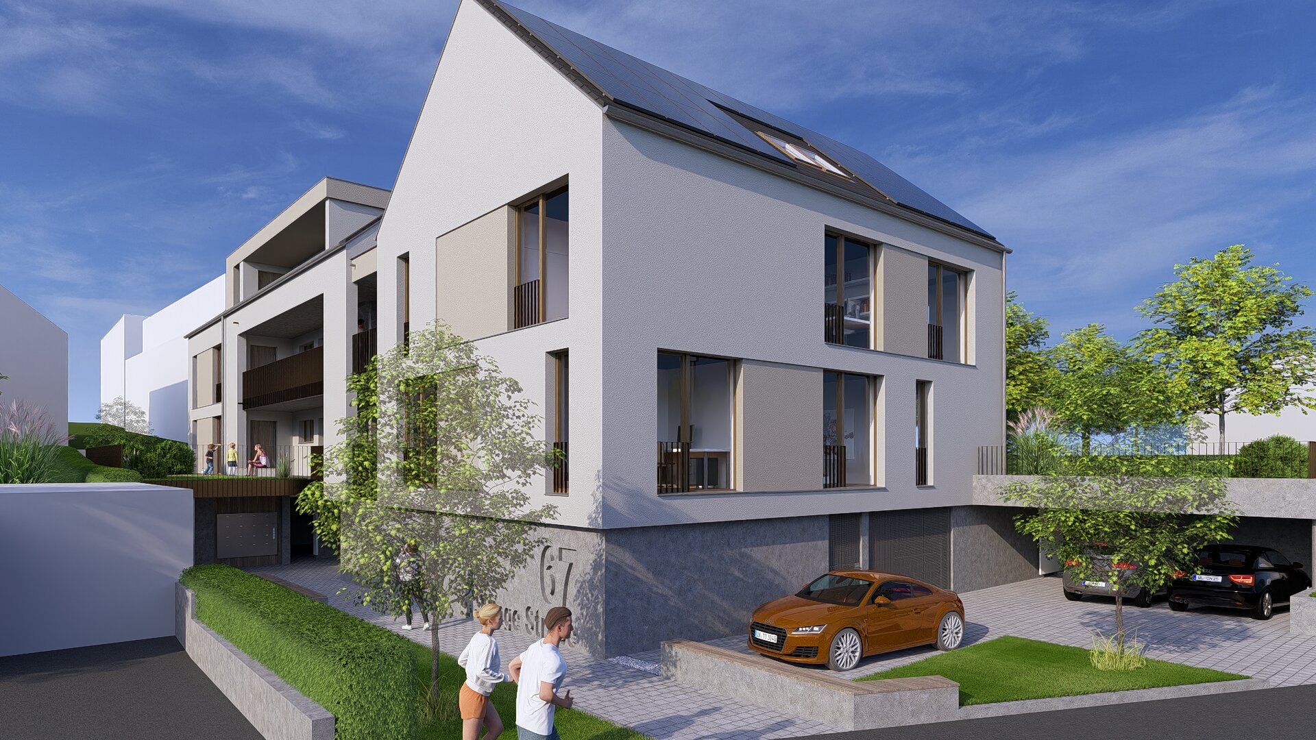 Wir bauen immer energetisch besser als es der Gesetzgeber mit dem Gebäudeenergiegesetz (GEG 2023) fordert. Die Dämmhülle des Projekts erfüllt in Verbindung mit der geplanten Heizungsanlage die Vorgaben für die Effizienzhaus-Stufe 40. Das sorgt für mehr Komfort und schont die Umwelt.
